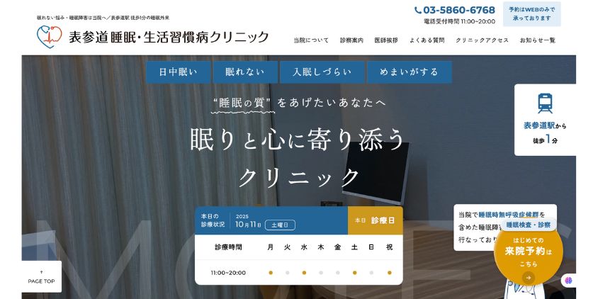 表参道 睡眠・生活習慣病クリニックは、月・水・土に診療しており、時間は11:00〜20:00。