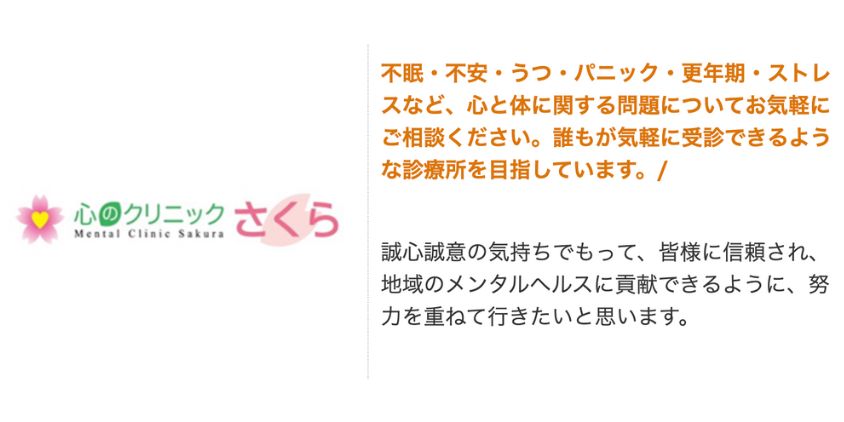 不眠・不安・うつ・パニック・更年期・ストレスなど、心と体の不調を幅広く扱うクリニックです。