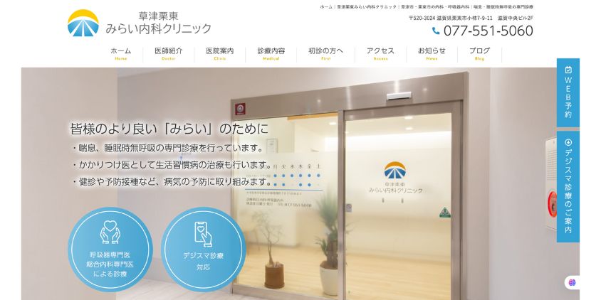 草津栗東みらい内科クリニックは、内科・呼吸器内科を中心に、喘息・アレルギー・睡眠時無呼吸症候群など専門診療にも対応しています。